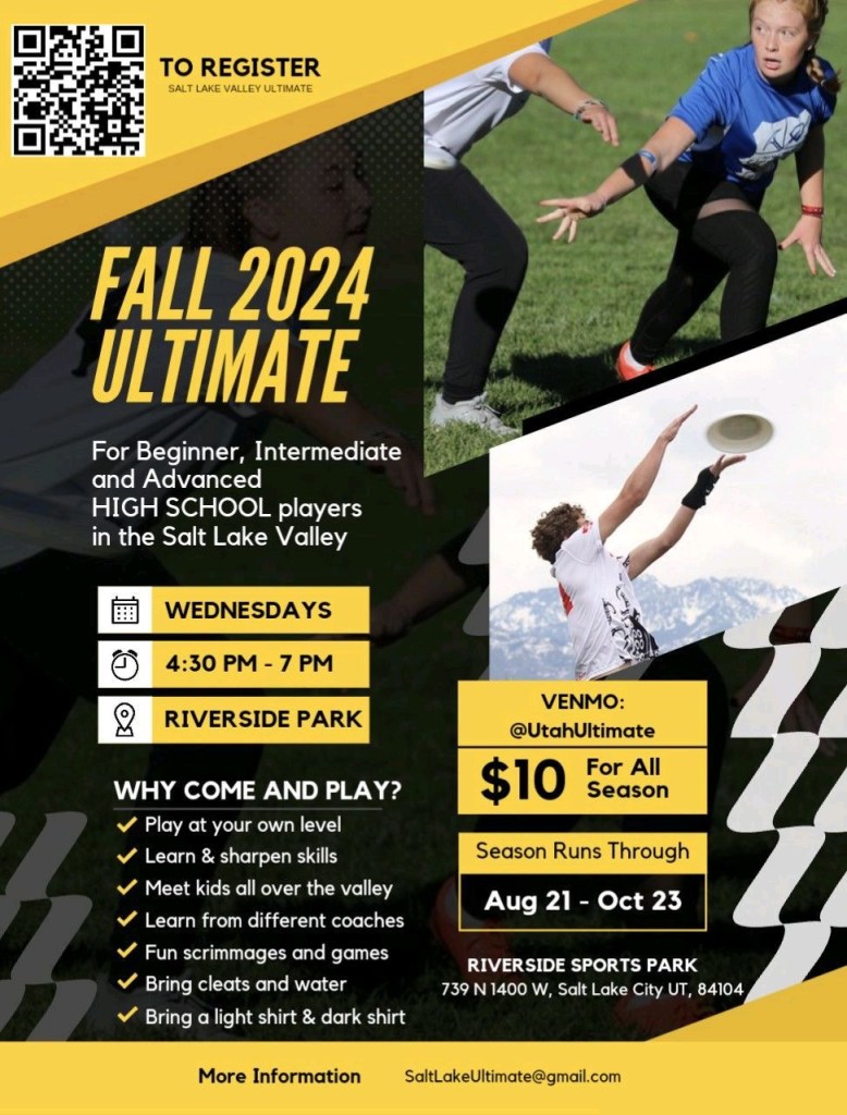 To compensate for the lack of games this fall, many of the coaches themselves have put together team-mix scrimmages every Wednesday from 4:30-7:00pm at Riverside Park. These will NOT be UUDA sanctioned games. Instead, all high school level players of any skill are invited out to practice and play with other high school players around the state. Players can choose who they want to play with and what coach they would like to learn from for the day. The goal for these practices/scrimmages is for payers to get experience working with new coaches and to have fun playing with different teams. It is $10 for the season to cover the cost of renting the field